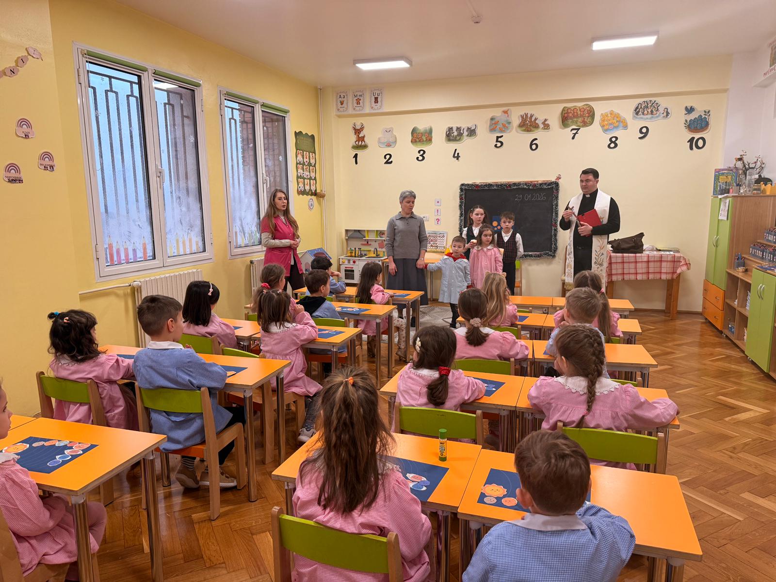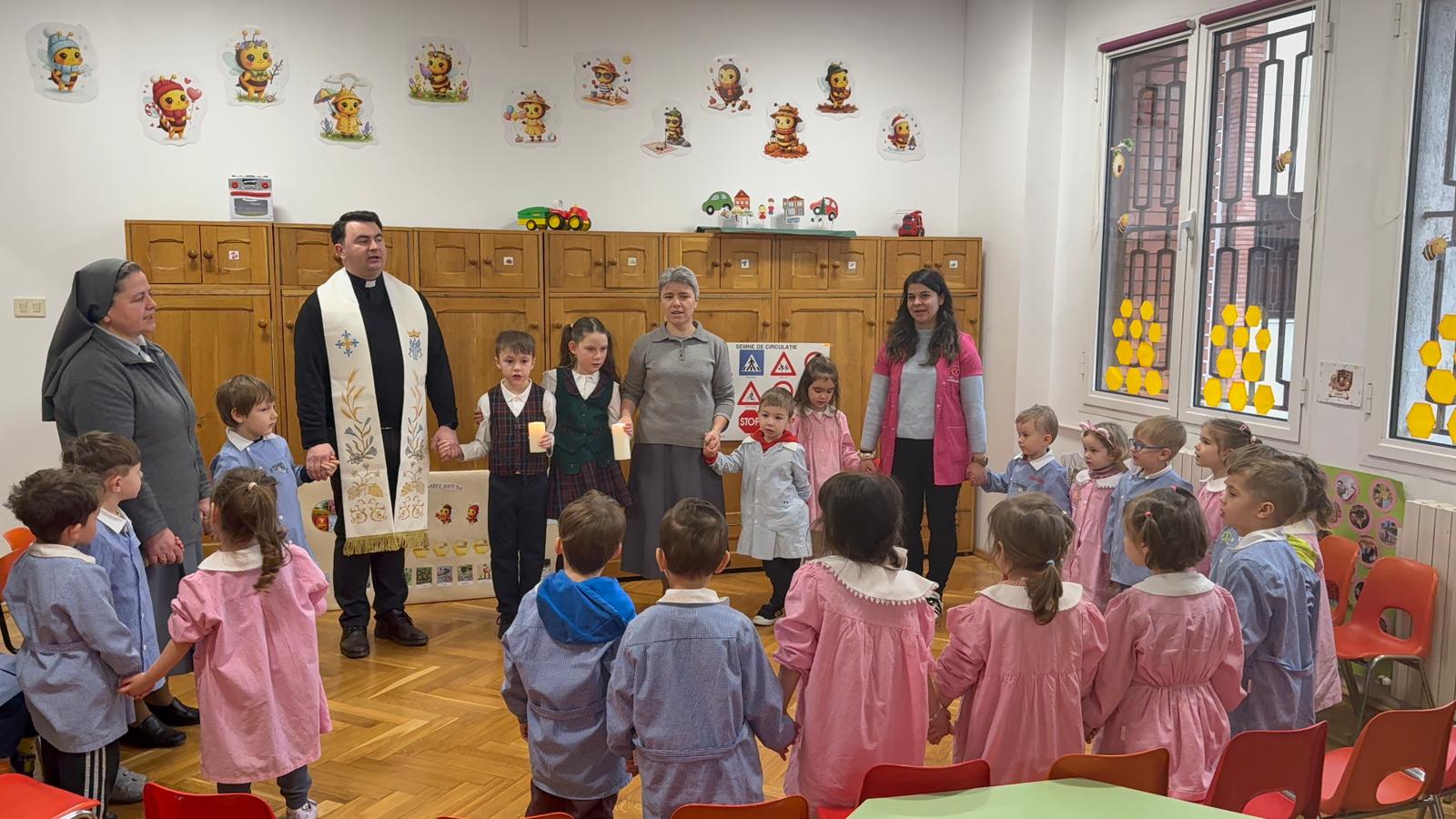 Un moment cu totul special a fost invitația părintelui de a ne ruga și pentru familiile copiilor. În fiecare grupă și clasă, copiii s-au rugat împreună cu părintele, surorile și angajații unității ce au însoțit procesiunea, rostind rugăciuni cunoscute și dragi: Tatăl nostru, Înger, îngerașul meu, Bucură-te, Marie, rugându-se pentru părinți și bunici.