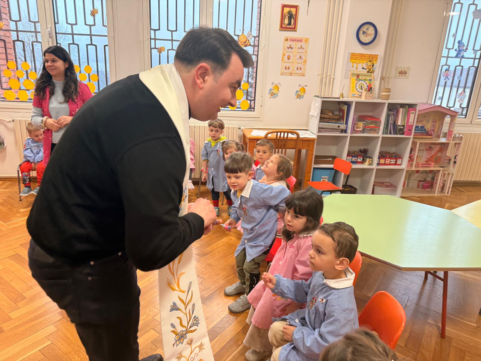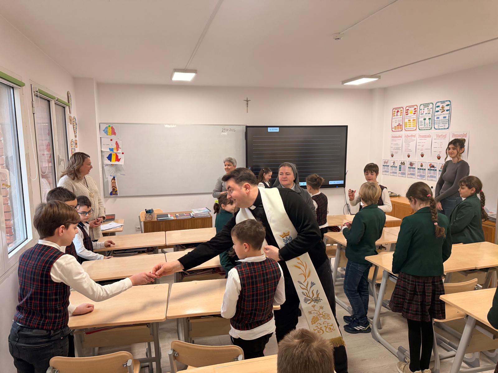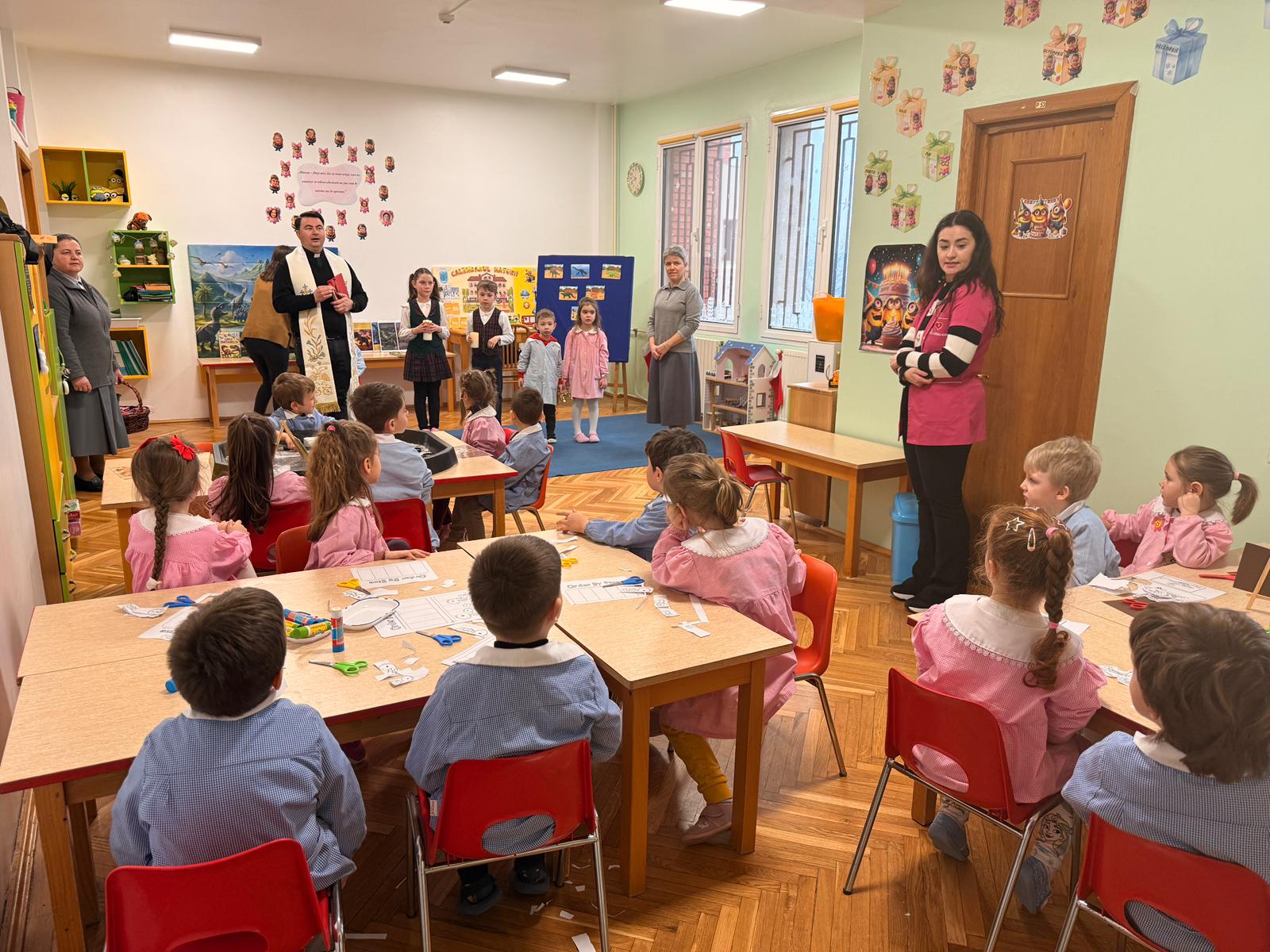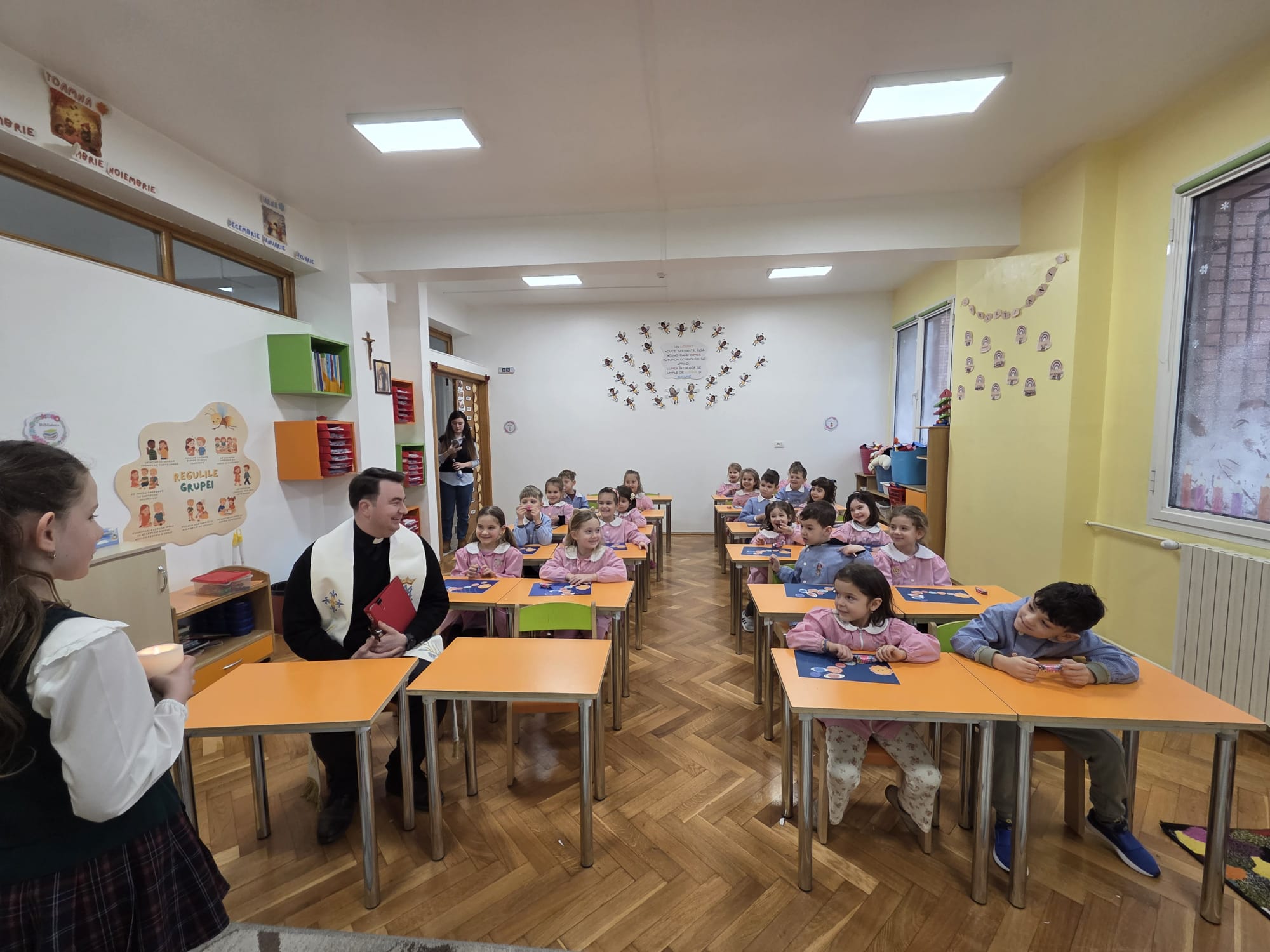 Astăzi, 29.01.2026, în unitatea noastră de învățământ a avut loc binecuvântarea copiilor, a cadrelor didactice și a întregii unități. Preotul Ștefan Simon, vicar al Catedralei Romano-Catolice din Iași, a adus în unitatea noastră binecuvântarea lui Dumnezeu, a rostit rugăciuni pentru sănătate, pace, reușite la învățătură și ocrotire. Mai mult decât atât, pr. Ștefan a interacționat cu preșcolarii și elevii într-o manieră deschisă, caldă și prietenoasă.